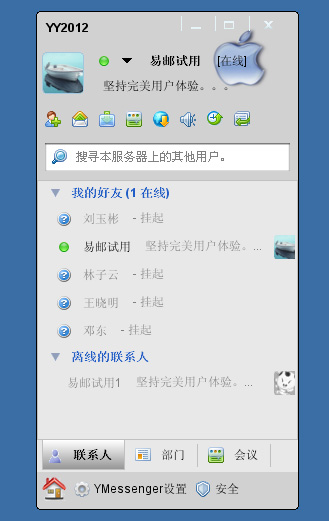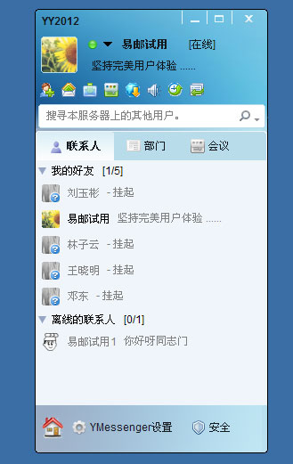 | YmailserverIM 易邮即时通讯软件 “易邮YY” 易邮即时通讯软件,易邮用户可在线登陆设置好友并即时聊天,传送文件等, 支持企业树状通讯录列表聊天。(包括IM服务器端软件及桌面客户端软件,均支持Windows,Linux,Unix) 易邮YY通讯平台,菜单、功能按钮条可以配置,可二次开发定义,可配置OA、人事系统、网站等其他信息系统的功能连接按钮。易邮通信平台将成为单位所有信息系统的通告交流平台,成为领导获取关键信息的有效途径。这样一来是易邮YY即时通讯平台成为整个单位信息化的统一入口、统一平台。