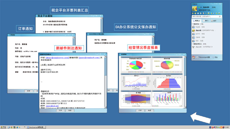 已有其他信息系统和YY整合,发送公告信息,公文催办,营业报表等,YY真实意义上的技术平台。 |